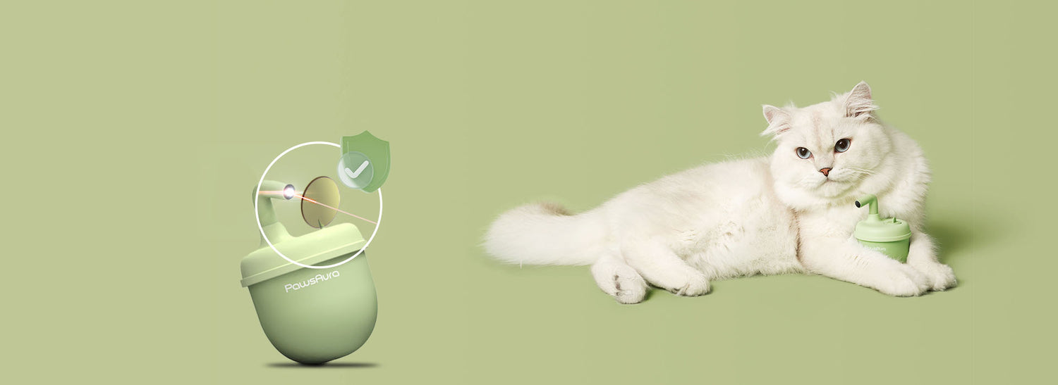 We use a class 2 laser, which is certified harmless to the eyes of cats and humans. Moreover, we used a brown light shield to further weaken the laser light.