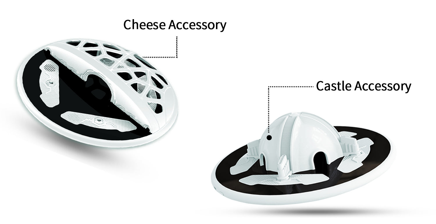 Additional accessories can be attached to the device to create different hideouts for the prey. Every hideout gives a different gaming experience making the device versatile. Hideouts let the cat observe the 'prey' from different angles and exercise the cat's ability to observe and hunt.